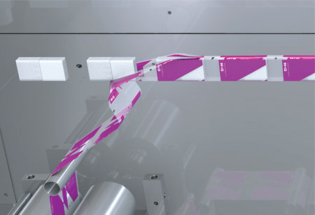 The converting unit. This is the first time ever that the cantilever design is applied to a handkerchief converter. In comparison to customary construction methods, the cantilever design significantly improves accessibility, making it easier to perform adjustments and maintenance tasks. In addition, complete modules such as the folding unit and the cross cutter are designed as quick-changeover sections so they can be removed from the machine in one block. The number of handkerchiefs per pile can be selected and changed merely via the control panel without exchanging any size parts. The single-pack wrapping machine – the FLOW-wrap process: The wrapper for single packages, patented by W+D, is based on the FLOW-wrap procedure, a technology that offers immense advantages in terms of machine flexibility. Compared to the long-established turn-table mode, it is now – and for the first time – possible to process packages of different heights with only a reasonable amount of effort, as may be required by varying handkerchief numbers per pile or when changing from a standard product to a compact (mini) product. Considerable material savings can be achieved thanks to reduced foil consumption.